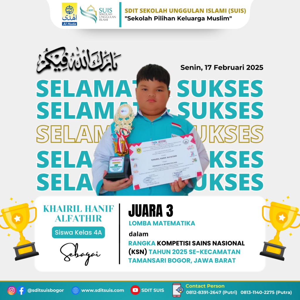 BOGOR – Gelombang prestasi membanggakan kembali menghampiri SDIT Sekolah Unggulan Islami (SUIS) Bogor salah satu unit pendidikan Yayasan Islam Al Huda Bogor. Dalam rangkaian kompetisi tingkat SD se-Kecamatan Tamansari yang diselenggarakan oleh K3S Tamansari, para delegasi terbaik sekolah sukses membawa pulang trofi kemenangan. Berikut adalah daftar ananda yang berhasil meraih prestasi gemilang: 1. Farihatul Kamilah (Kelas […]